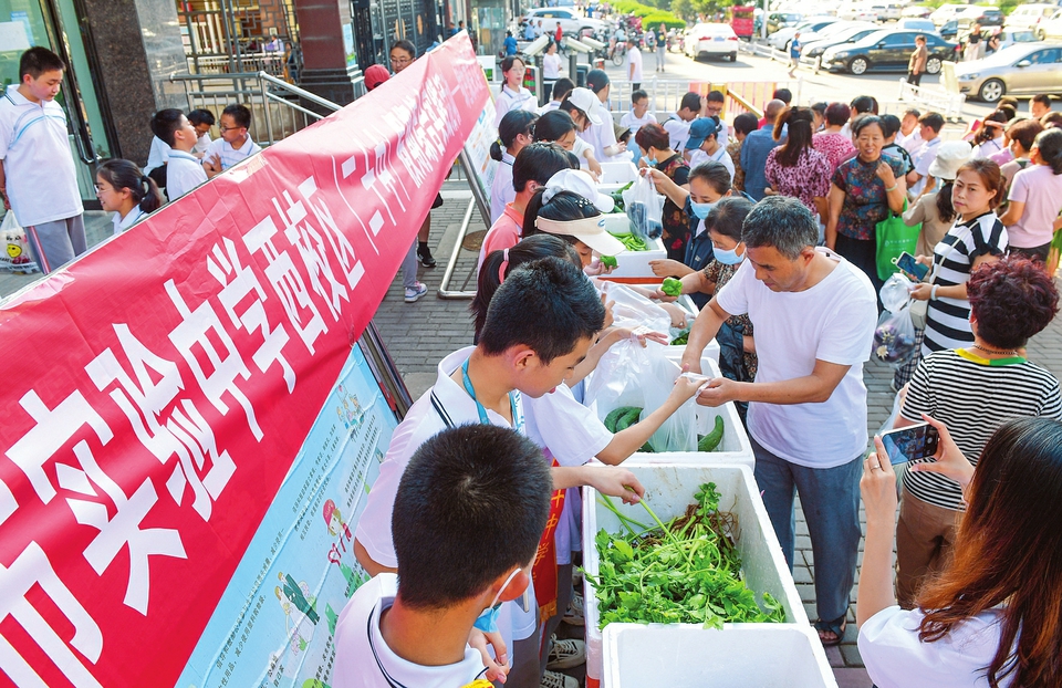 7月21日,在长治市滨湖路社区党群服务中心门前,阵阵稚嫩的吆喝声,吸引来不少过往路人。当日,长治实验中学西校区的学生们将自己在学校“开心农场”采摘的300余公斤蔬菜进行义卖,所得将全部用于资助贫困学生。梁栋摄