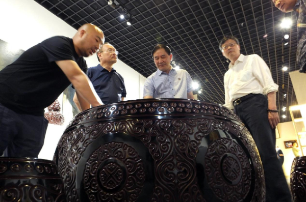 在绛州剔犀黄河云雕文化产业园,传承人何鹏飞(左)向湖笔协会考察团介绍制作技艺。