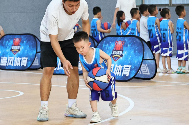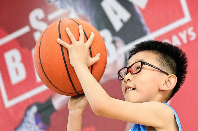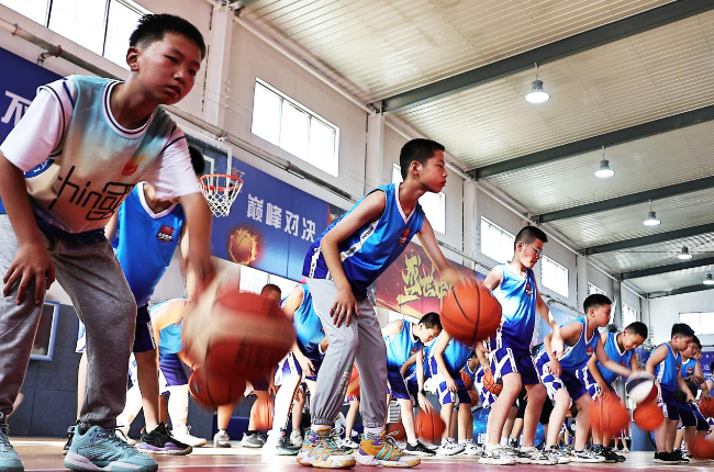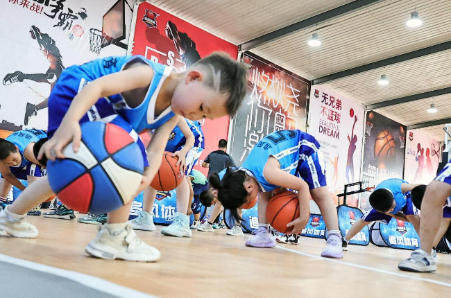 小朋友们在练习篮球传球技能。(高新生 摄)