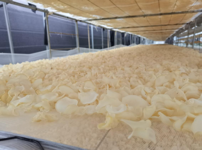 交城县庞泉沟镇顺鑫农林专业合作社的食用菌种植基地大棚内,已经成熟的吊袋白木耳迎来了第四茬采摘季节。据合作社负责人介绍,目前基地共种植26个大棚,悬挂了35.5万个菌棒,木耳总产量能达到2.2万公斤左右,预计2023年村集体经济将增收10万元左右。