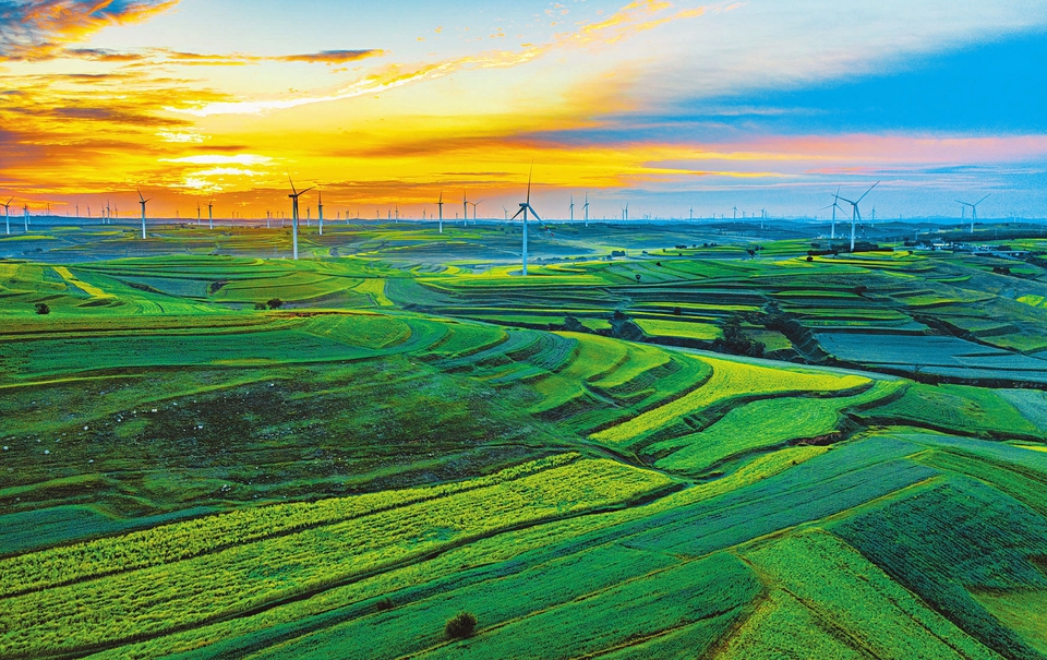 8月5日,朔州市平鲁区高石庄乡盛开的万亩油菜花海与风电设备、村庄相映成景,勾勒出一幅塞上绿洲美景。(杨建峰摄)