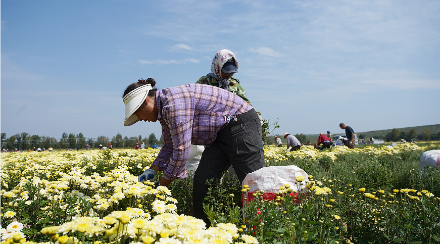 满地金蕊竞绽放,秋风初起菊花香。初秋时节,山西忻州市五寨县种植的2000亩菊花迎来了采收期,朵朵菊花迎风绽放,散发缕缕清香。小小的菊花不仅扮靓了田野,还绽放出“美丽经济”,带动当地群众在“家门口”增收。