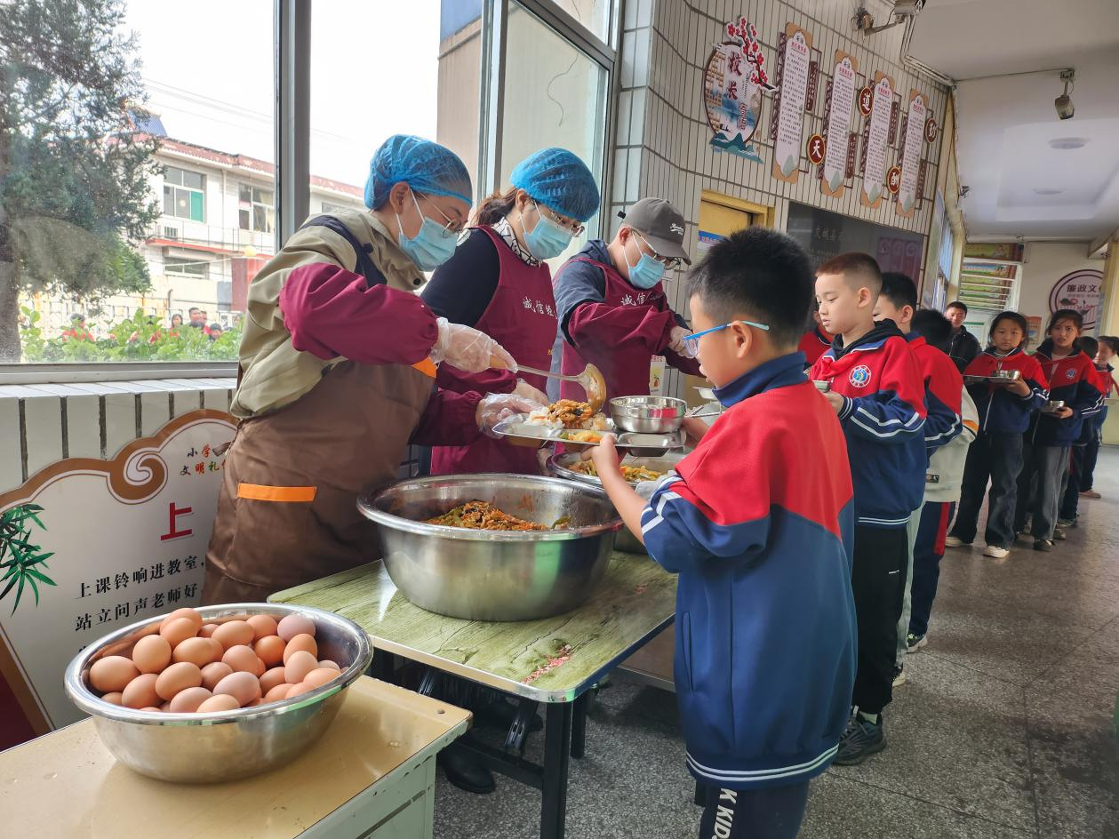 伴随着上午最后一节课下课铃声响起,食堂工作人员将饭菜送到指定位置,确保学生及时吃到热腾腾的饭菜,菜式荤素搭配,保证孩子们的营养需求。