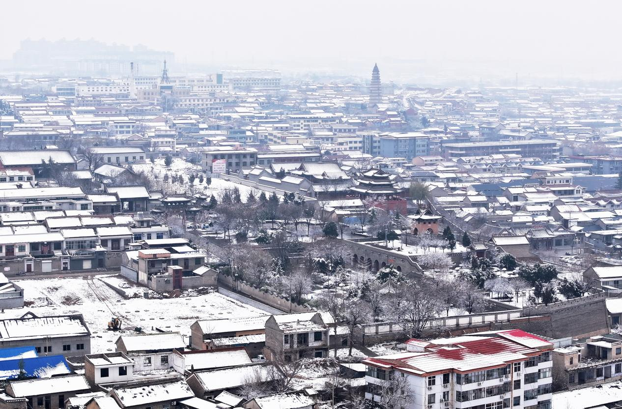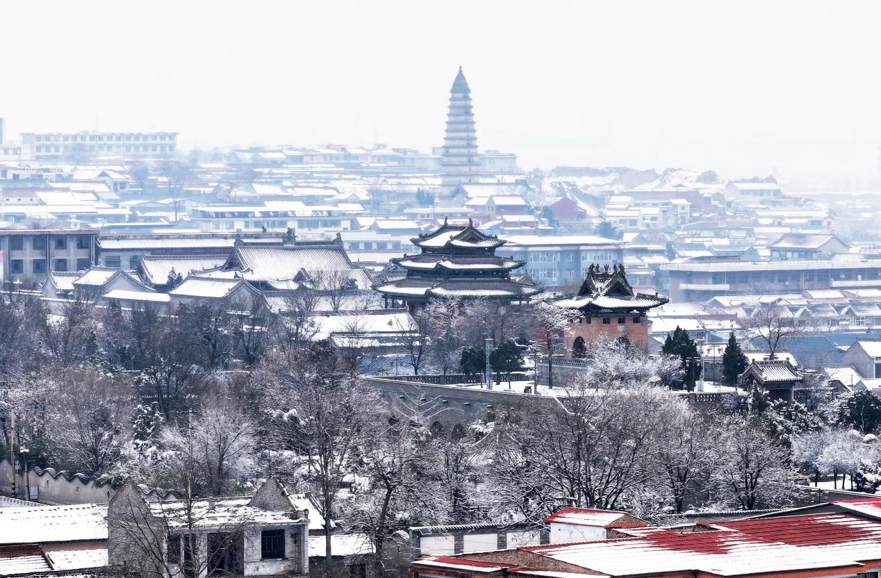 12月11日,山西省运城市新绛古城迎来瑞雪,龙兴寺、鼓楼、绛州署、城隍庙等银装素裹,步步成景。千年古建在白雪的衬托下,更显古韵风姿。