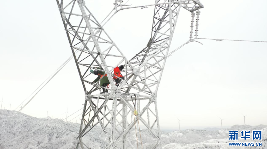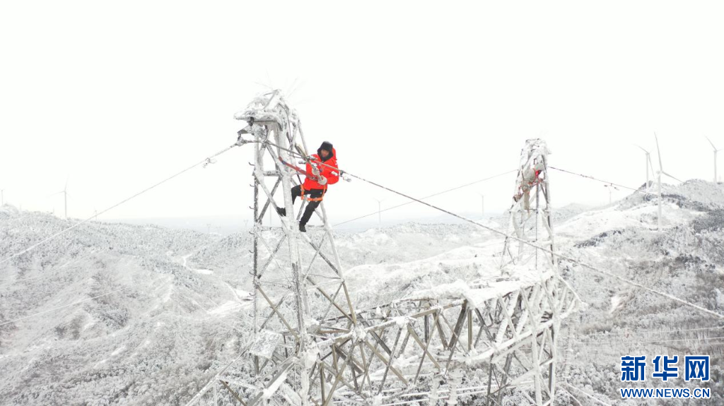为了尽快修复线路,电力工人连续作战。新华网 发(王浩 摄)