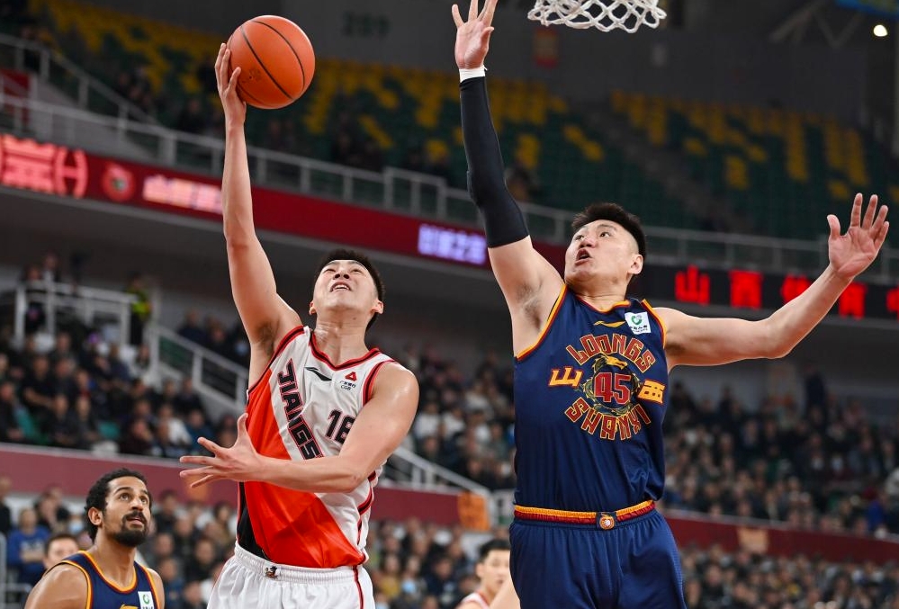 1月15日,江苏肯帝亚队球员蒋浩然(左)在山西汾酒队球员常林的防守下上篮。