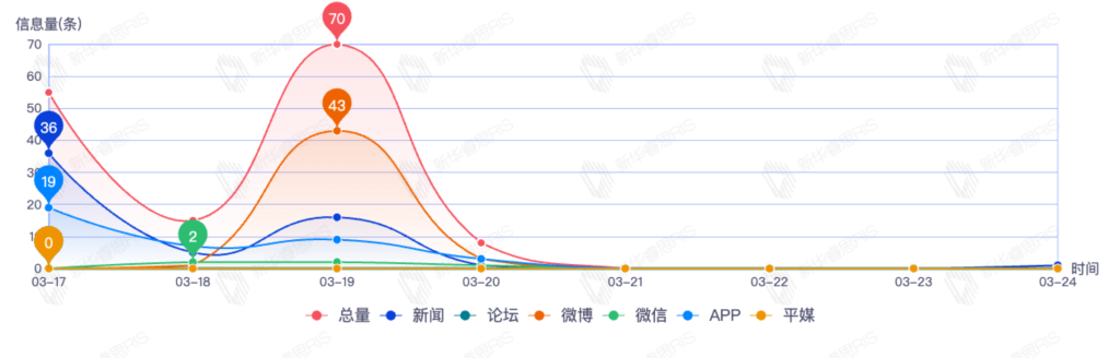 截至目前,该文章在互联网上传播总量149篇。其中3月19日是传播的高峰期,共传播70篇文章。各信源的信息发布情况中,新闻信息占比最大,其次是微博和APP,占比分别为36.17%、33.33%、26.95%。(数据来源:新华睿思数据云图分析平台)