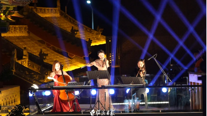 夜色中,财神庙的轮廓在灯光映照下显得更加古朴典雅。阳台上,灯光温暖柔和,为这场音乐会增添了几分梦幻色彩。一曲浪漫的《一步之遥》率先奏响,小提琴的悠扬、大提琴的深沉、单簧管的柔美、长笛的清澈、钢琴的激昂交织在一起,为观众带来一场听觉盛宴。