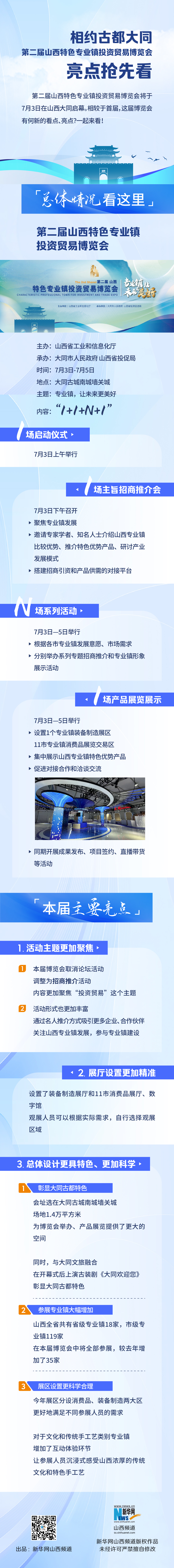 第二届山西特色专业镇投资贸易博览会将于7月3日在山西大同启幕。相较于首届,本届博览会有何新的看点、亮点?一起来看!