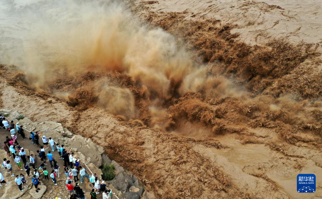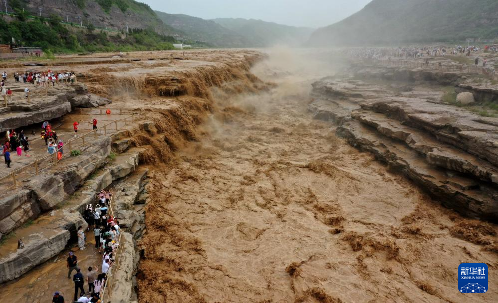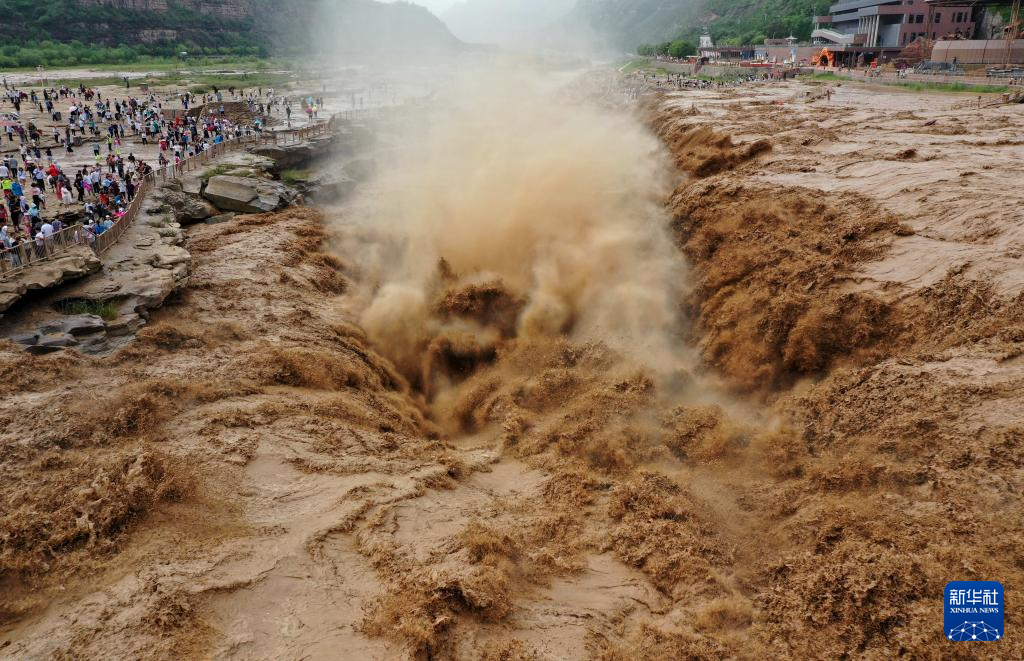 连日来,受黄河中游强降雨影响,位于山西吉县和陕西宜川县交界的黄河壶口瀑布迎来今年入汛以来最大流量洪水。主副瀑布连成一线,宽度达到200余米,再现壮观黄色瀑布群。