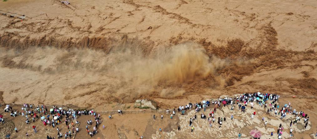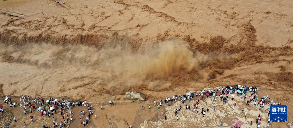 8月10日,游客在山西吉县黄河壶口瀑布游览观瀑(无人机照片)。