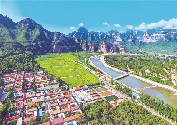 8月18日,俯瞰左权县麻田镇东安村,太行山脉与清漳河、稻田、民居交相辉映,构成了一幅和美乡村田园画卷。近年来,东安村以发展优质水稻产业为龙头,紧抓农旅融合,利用稻草资源建设了稻田公园,吸引了游客和美院师生等前来打卡、写生,为乡村振兴注入活力。(通讯员 邢兰富 摄)