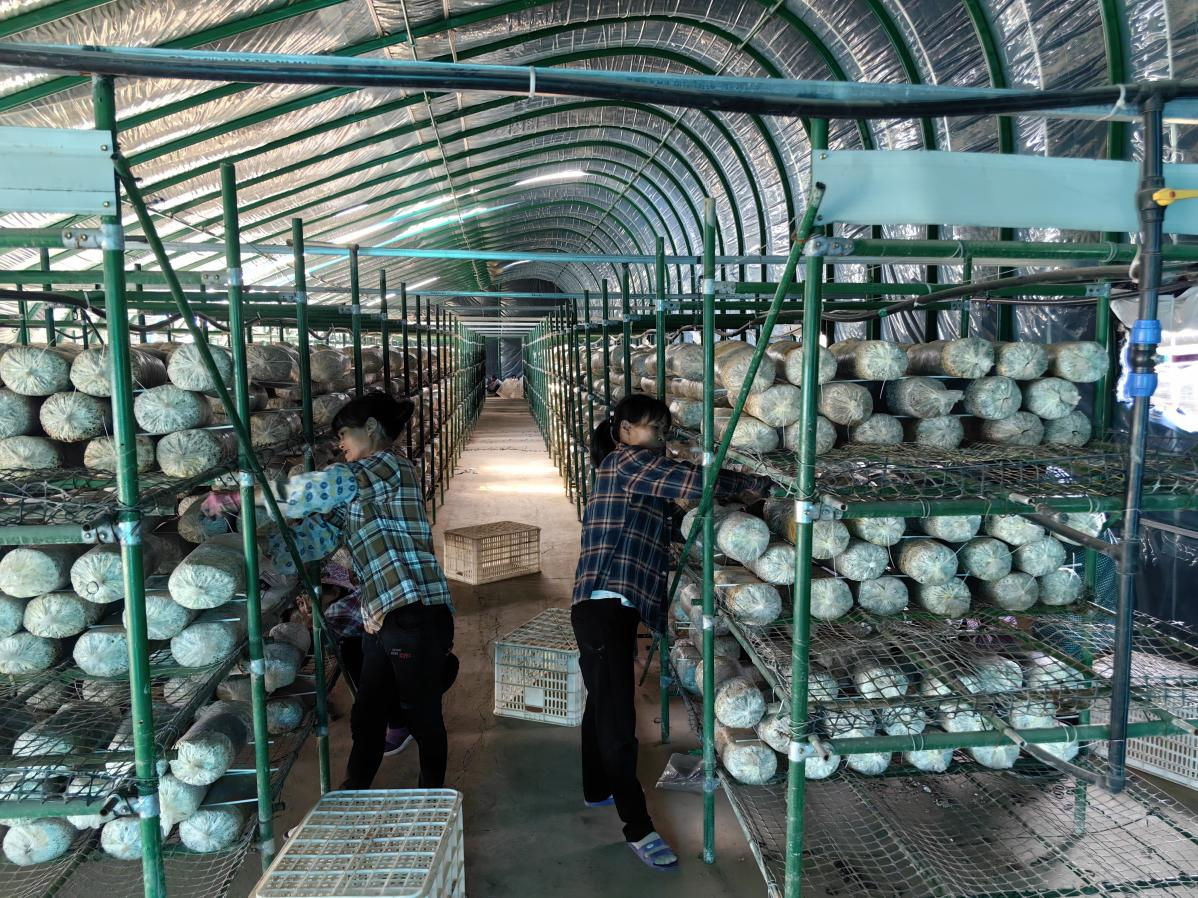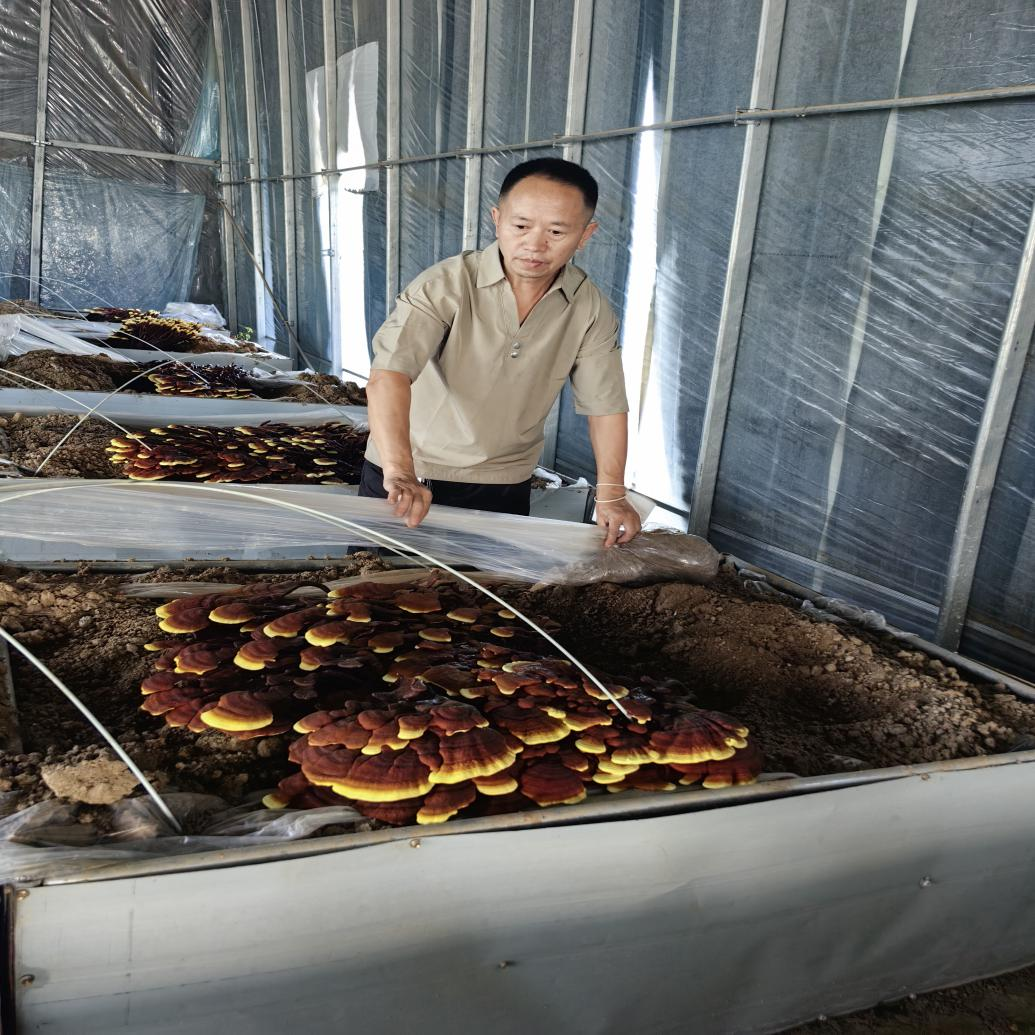 技术人员观察灵芝长势。(李常慧 摄)