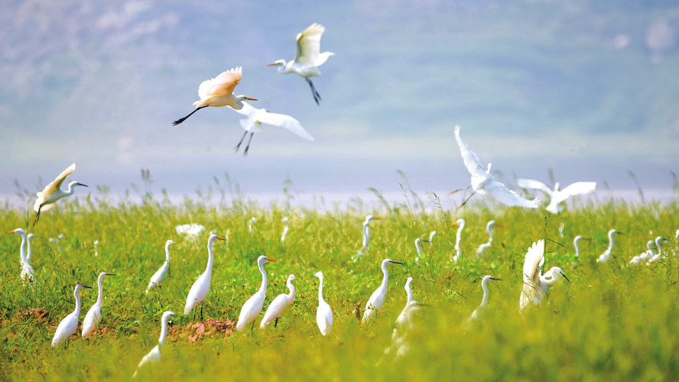 9月4日,成群的白鹭等候鸟在垣曲县古城国家湿地公园栖息觅食。近年来,当地加大了黄河湿地保护和恢复力度,这里以优美的生态环境成为各种候鸟重要的栖息地,吸引大量鸟类前来“安家”繁衍。