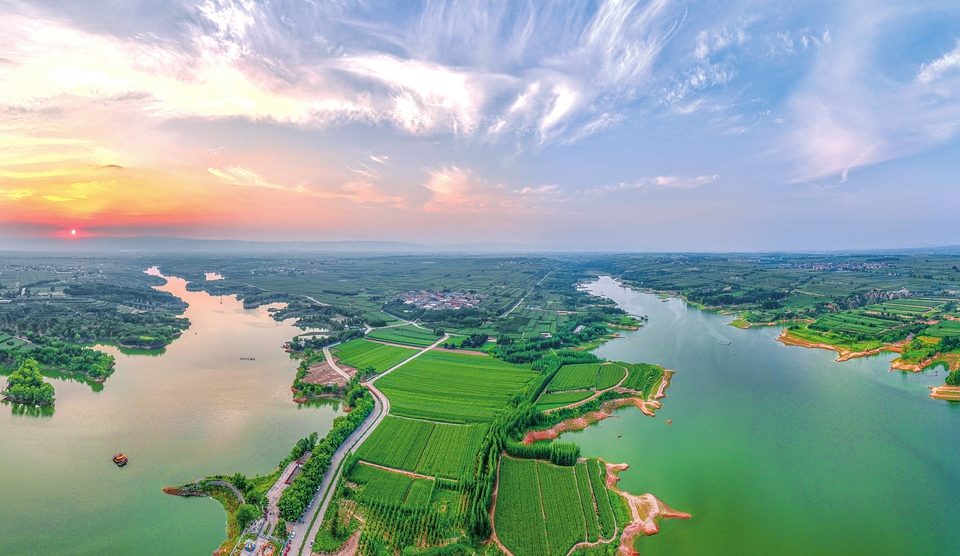 9月4日,航拍镜头下的襄汾县双龙湖国家湿地公园景色如画。初秋时节,公园内绿草繁盛,田园、树木、晚霞、村庄相映成趣,勾勒出一幅静谧迷人的生态画卷。
