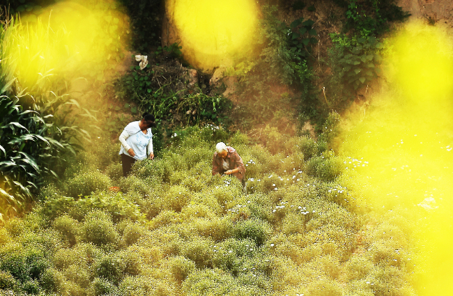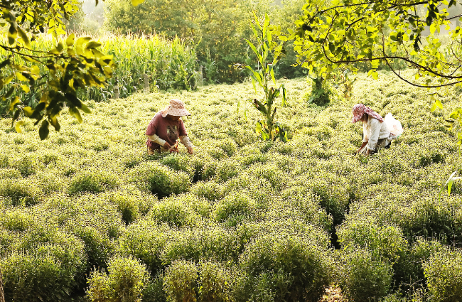 在山西省运城市新绛县姑射山下泽掌镇乔沟头村,药农采摘菊花。(高新生 摄 )
