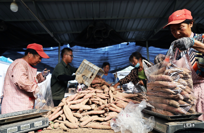 在山西省运城市新绛县三泉镇孝陵庄村一家种植专业合作社,社员对收获的红薯进行分拣。(高新生 摄 )