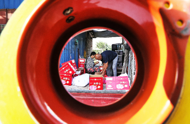 运城市新绛县龙兴镇段家庄村村民将苹果分拣、套袋、装箱。(高新生 摄 )