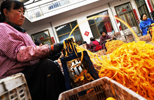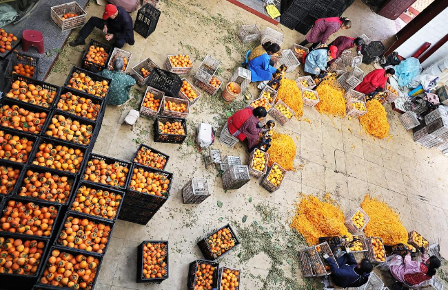 柿农加紧削皮加工柿子。(高新生 摄)