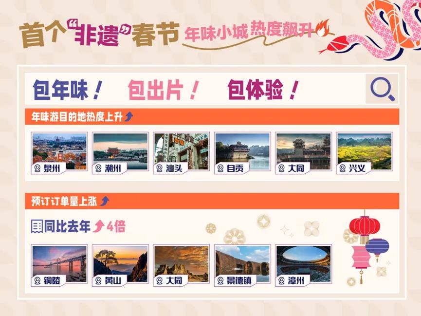 报告提出,作为“申遗成功”的首个春节假期,打卡非遗体验活动,过个地道的中国年,“年味游”正成为2025春节国内游游客的不二之选。携程数据显示,春节期间,大同等小众目的地热度飙升。