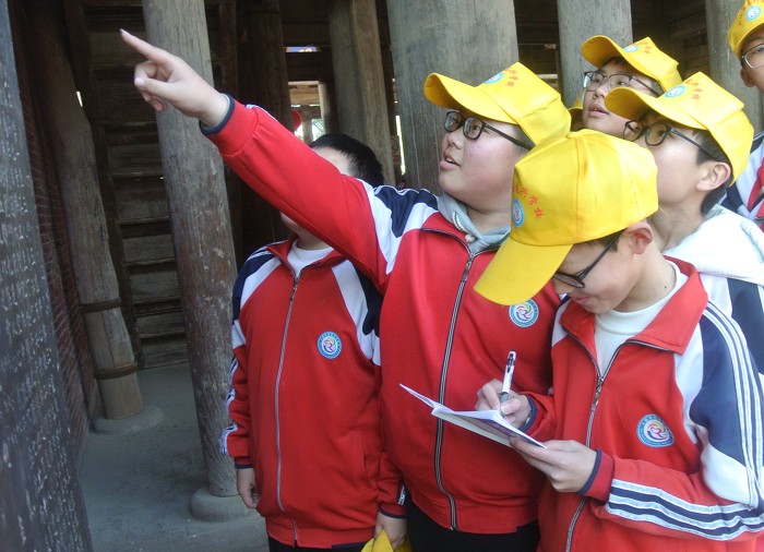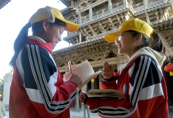 听完讲解之后,学生们兴致勃勃地站在飞云楼下,仔细辨别飞云楼的暗五层;还有的学生围在一起抄写碑文……一时间好不热闹。此次研学活动,让学生对河东大地的热爱,感受古建筑的魅力,体悟中国传统文化的博大精深。(图片拍客 张怀心)