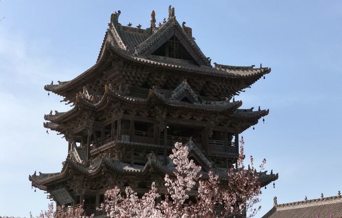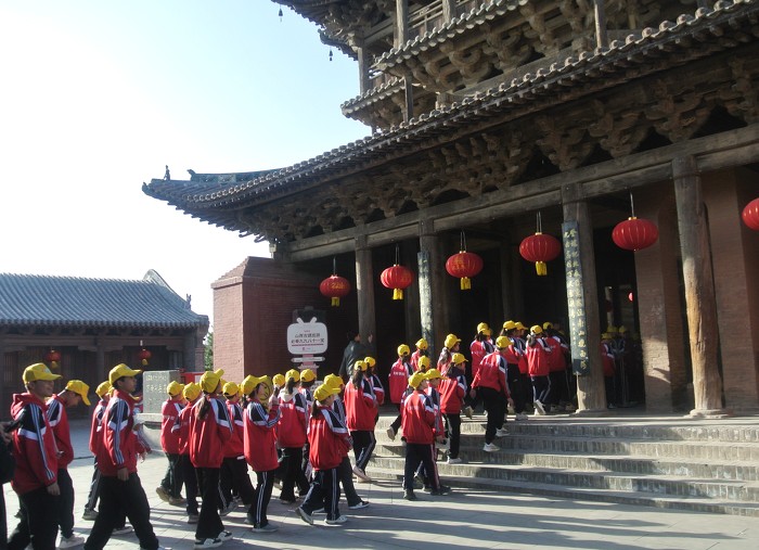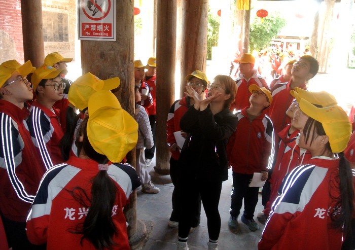 在现场,学生们通过讲解员讲解,知道了飞云楼结构繁复瑰丽,建筑技艺的高超水平,与应县木塔并称北塔南楼。全楼为纯木质结构,斗拱密布,所有接口均为榫卯套之,345组斗拱使其形态变化多端犹如云朵簇拥,层层相叠的斗拱又似云带缠绕,飞云楼也因此得名。其最大的特点是三层四出檐,明三层暗五间。