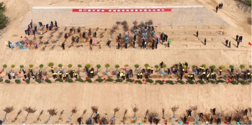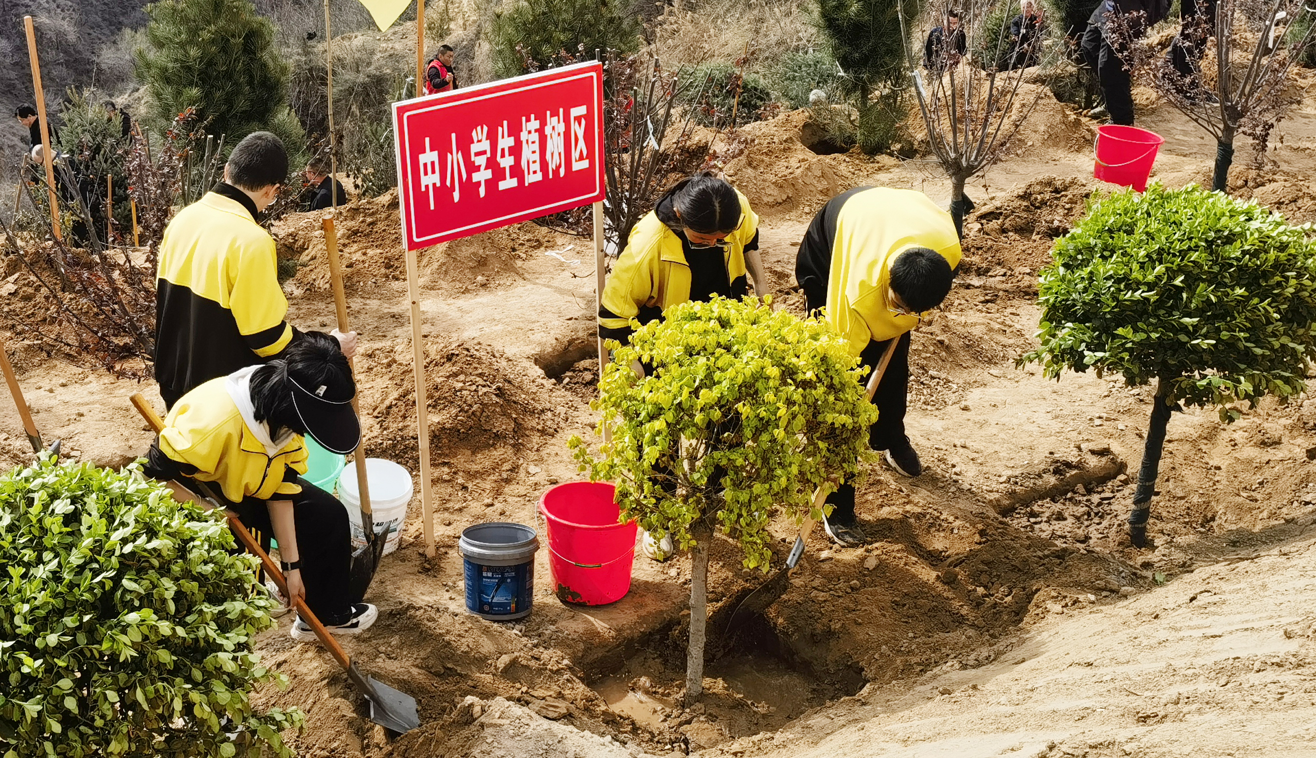 现场,参与人员分工协作,进行挥锹挖坑、扶苗培土等一系列工作,合力栽种白皮松、海棠、金叶榆、太阳李、云杉等新树,放眼望去,一株株新种下的树苗迎风挺立、生机勃勃。