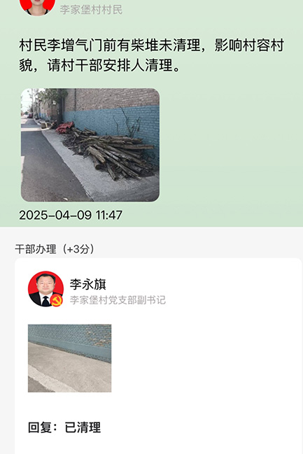“2025年4月9日11点24分,村民反映:李某某门前柴堆未清理,影响村容村貌,请村干部安排人清理。”