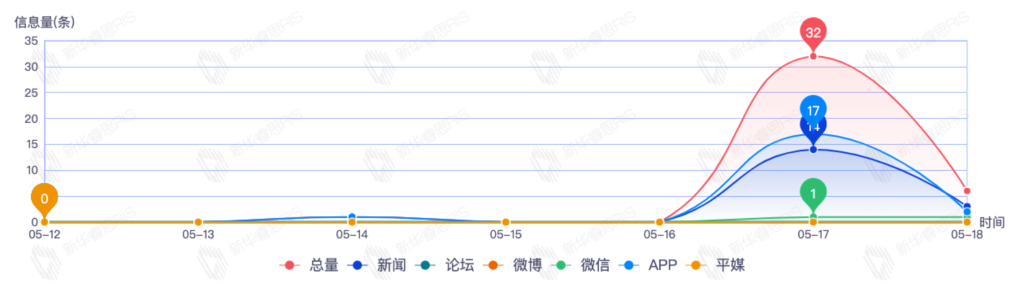 截至目前,该文章在互联网上传播总量共39篇。其中,5月17日是传播的高峰期,共传播32篇文章。各信源的信息发布情况中,APP信息占比最大,其次是新闻和微信,信息量分别为20、17、2,占比分别为51.28%、43.59%、5.13%。(数据来源:新华睿思·数媒智慧分析平台)