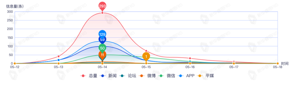 截至目前,该文章在互联网上传播总量共448篇。其中,5月14日是传播的高峰期,共传播293篇文章。各信源的信息发布情况中,APP信息占比最大,其次是新闻和微信,信息量分别为176、144、101,占比分别为39.91%、32.65%、22.90%。(数据来源:新华睿思·数媒智慧分析平台)