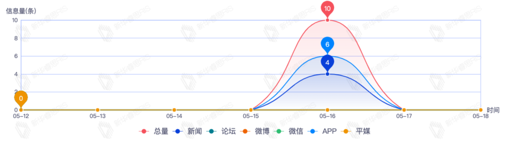 截至目前,该文章在互联网上传播总量共10篇。其中,5月16日是传播的高峰期,共传播10篇文章。各信源的信息发布情况中,APP信息占比最大,其次是新闻,信息量分别为6、4,占比分别为60.00%、40.00%。(数据来源:新华睿思·数媒智慧分析平台)
