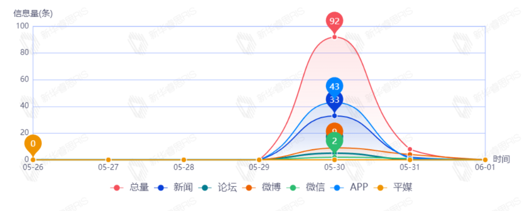 截至目前,该文章在互联网上传播总量100篇。其中5月30日是传播的高峰期,共传播92篇文章。各信源的信息发布情况中,APP信息占比最大,其次是新闻和微博,占比分别为43.43%、35.35%、13.13%。(数据来源:新华睿思数据云图分析平台)