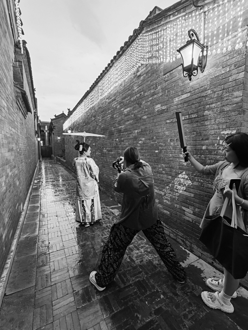 而对于年轻人而言,古装写真更是一种“文化表达”与“社交展示”的载体。在社交媒体上,不少游客晒出“钟楼街夜拍”“晋祠园林风”等照片,配文多为“圆了汉服梦”“体验晋商文化”。“我在小红书看到钟楼街的夜景图,特意从石家庄过来拍照,发朋友圈后好多人问链接。”游客刘小姐展示着手机里的成片,照片中,她身着晚清旗袍站在灯下,身后是熙攘的市井烟火,“这种‘古今碰撞’的感觉很吸引人。”
