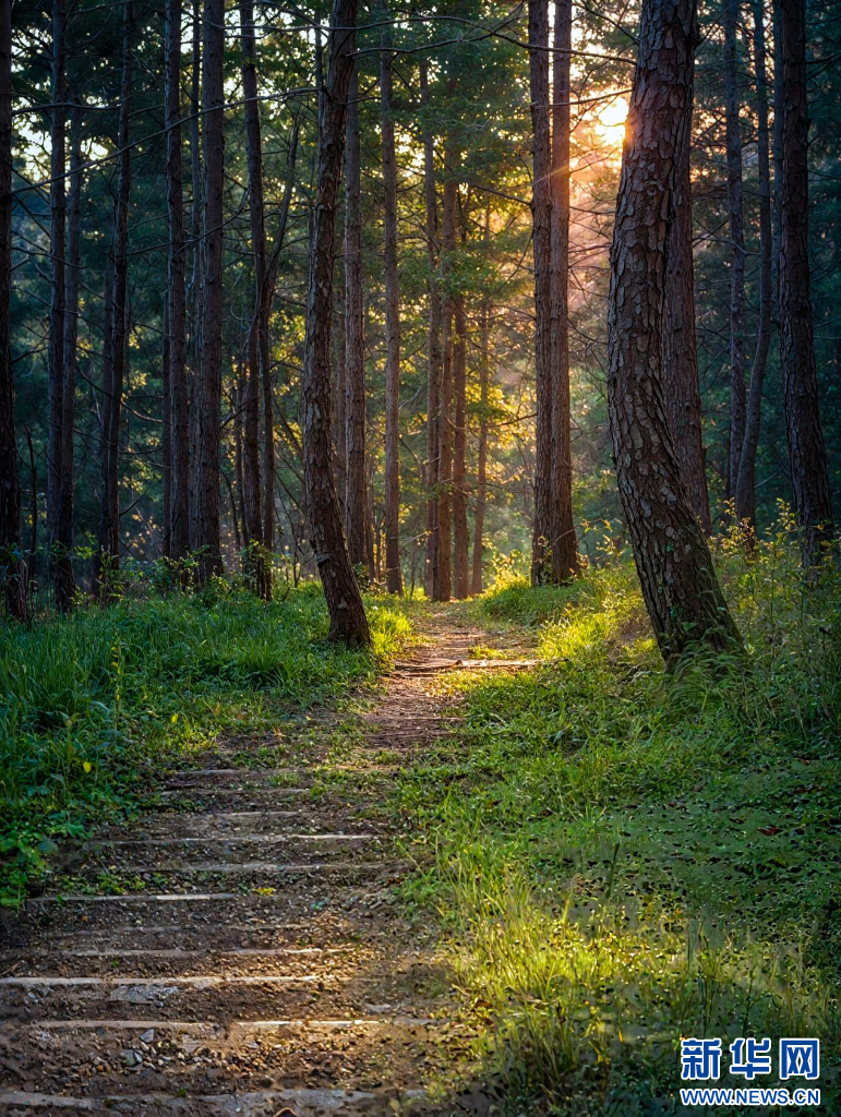 晨光透过松枝铺在林间小径上,等一双脚步来叩响。新华网 发