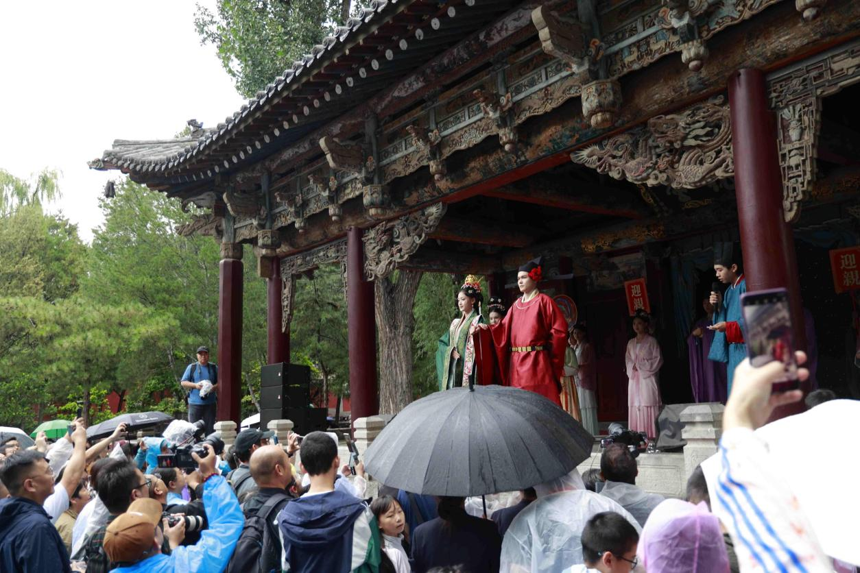 胜瀛楼与水镜台前,一场还原宋制婚礼的情景表演吸引了众多游客驻足观看。从“三书六礼”到“合卺结发”,传统婚俗的礼仪细节通过艺术化呈现,让观众得以沉浸式体验古代婚礼的文化魅力,也让这场表演成为了传承中华婚俗文化的鲜活课堂。