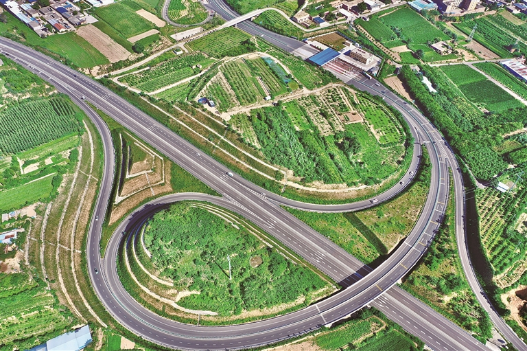 9月4日,俯瞰运三高速公路平陆枢纽互通区,道路纵横交错、四通八达,与周边农田、村庄等共同构成一幅壮美的交通图景。郝 健摄