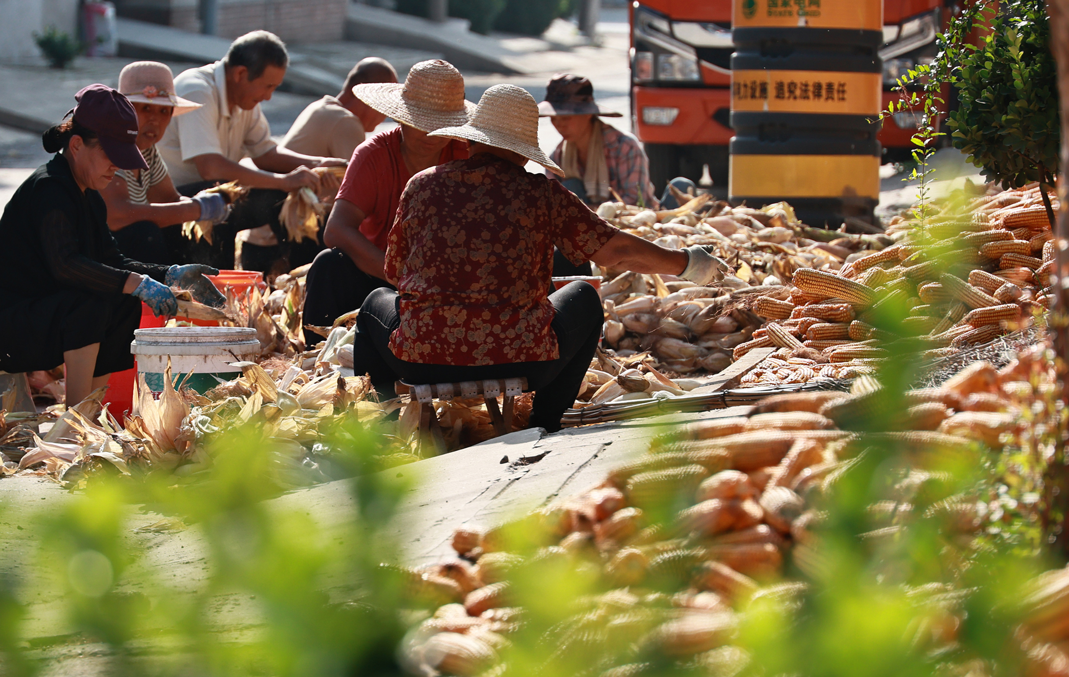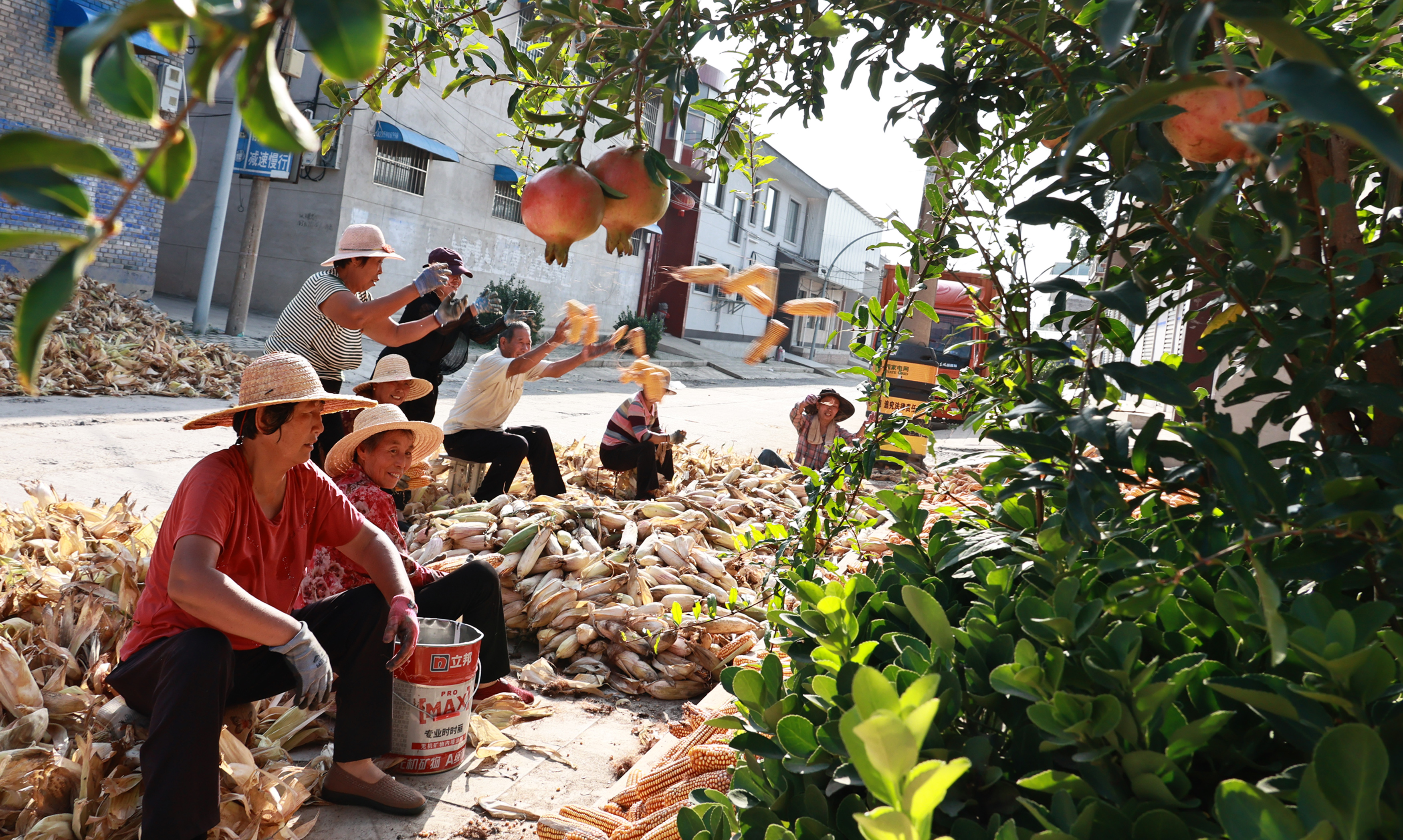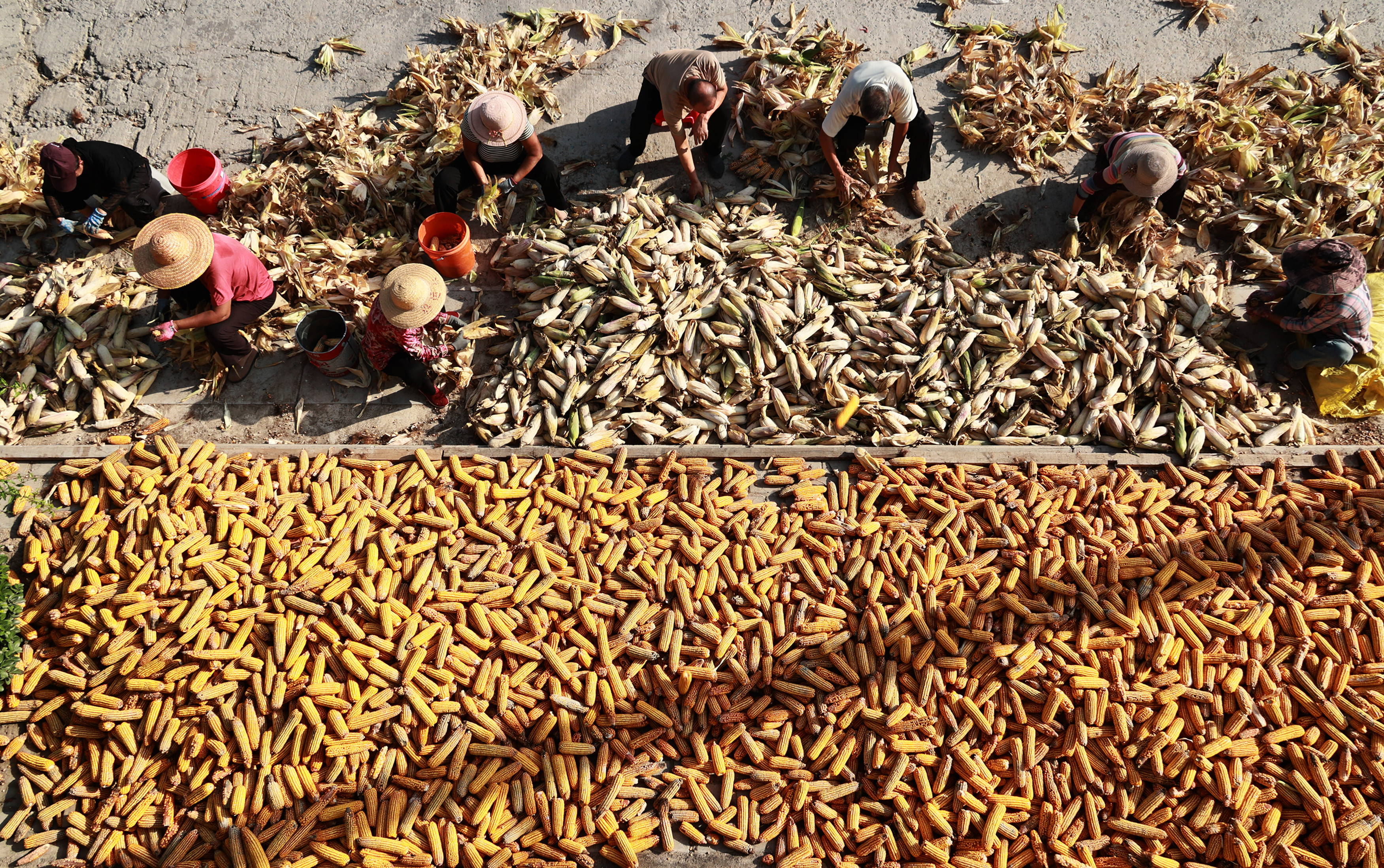 村民们在空地上晾晒金黄的玉米。