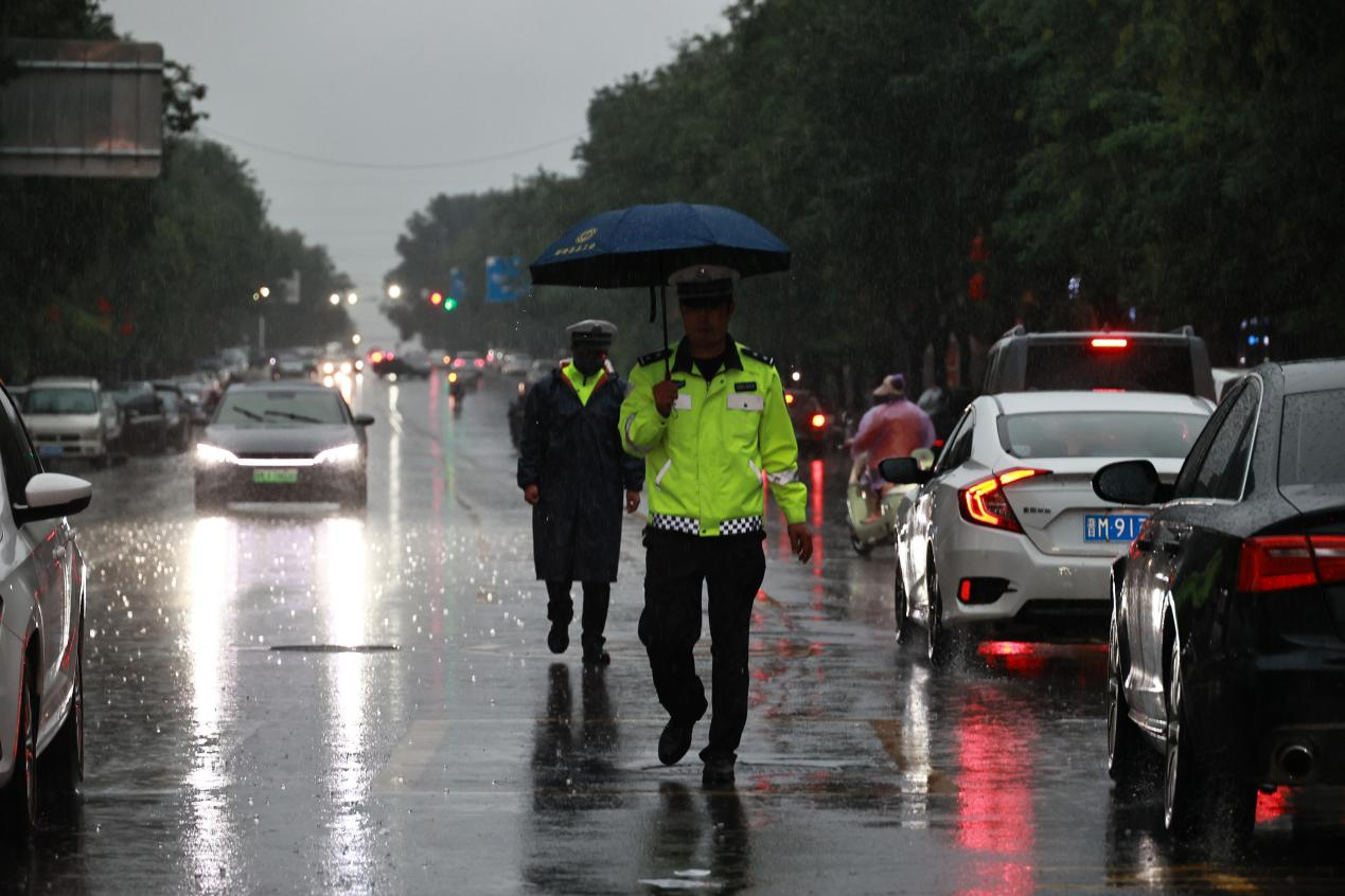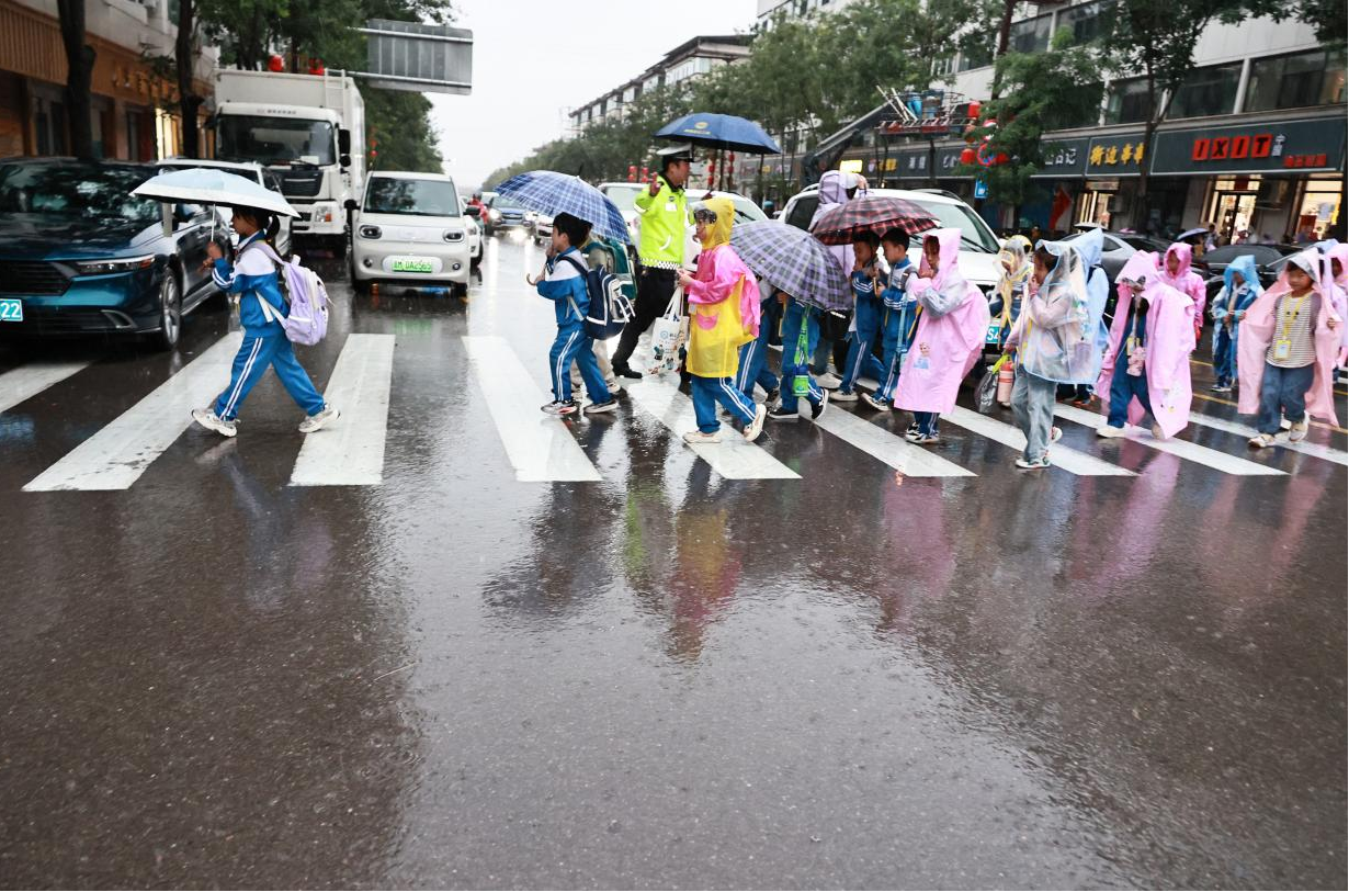 近日,运城市新绛县迎来降雨天气,当地迅速启动恶劣天气应急预案,交警全天候在岗,守护学校等重点路段道路交通安全。
