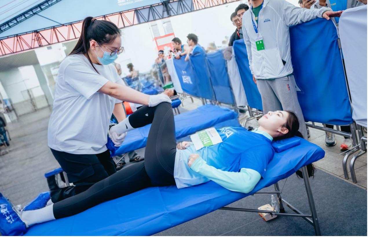 现场设置的全球通恒温拉伸服务区可为参赛者提供专业的拉伸服务,有助于缓解肌肉紧张与运动疲劳。同时,全球通还提供了丰富的赛后补给,帮助参赛者及时补充能量,加速体能恢复。赛事号码布塑封服务可为参赛者留存专属的跑马记忆。