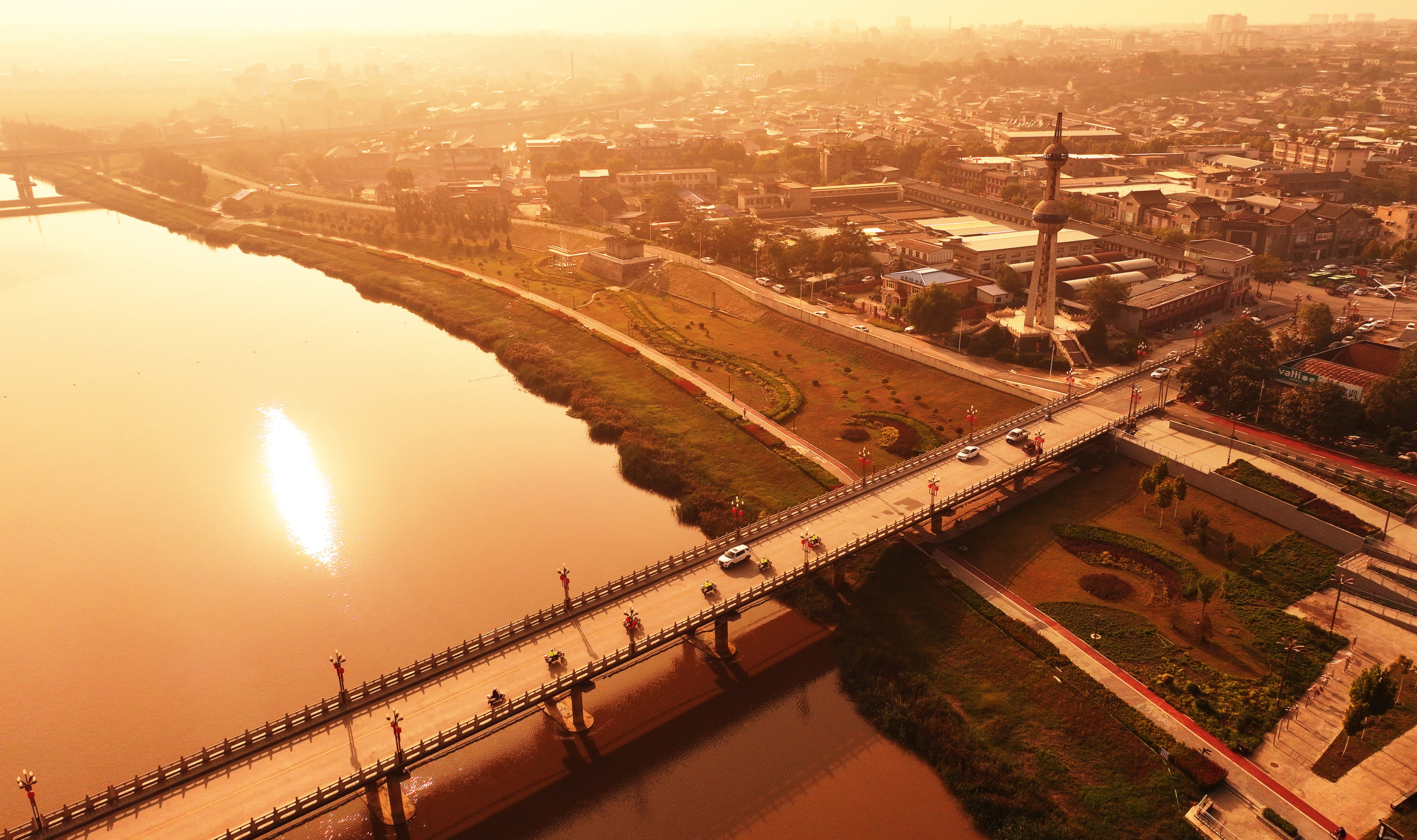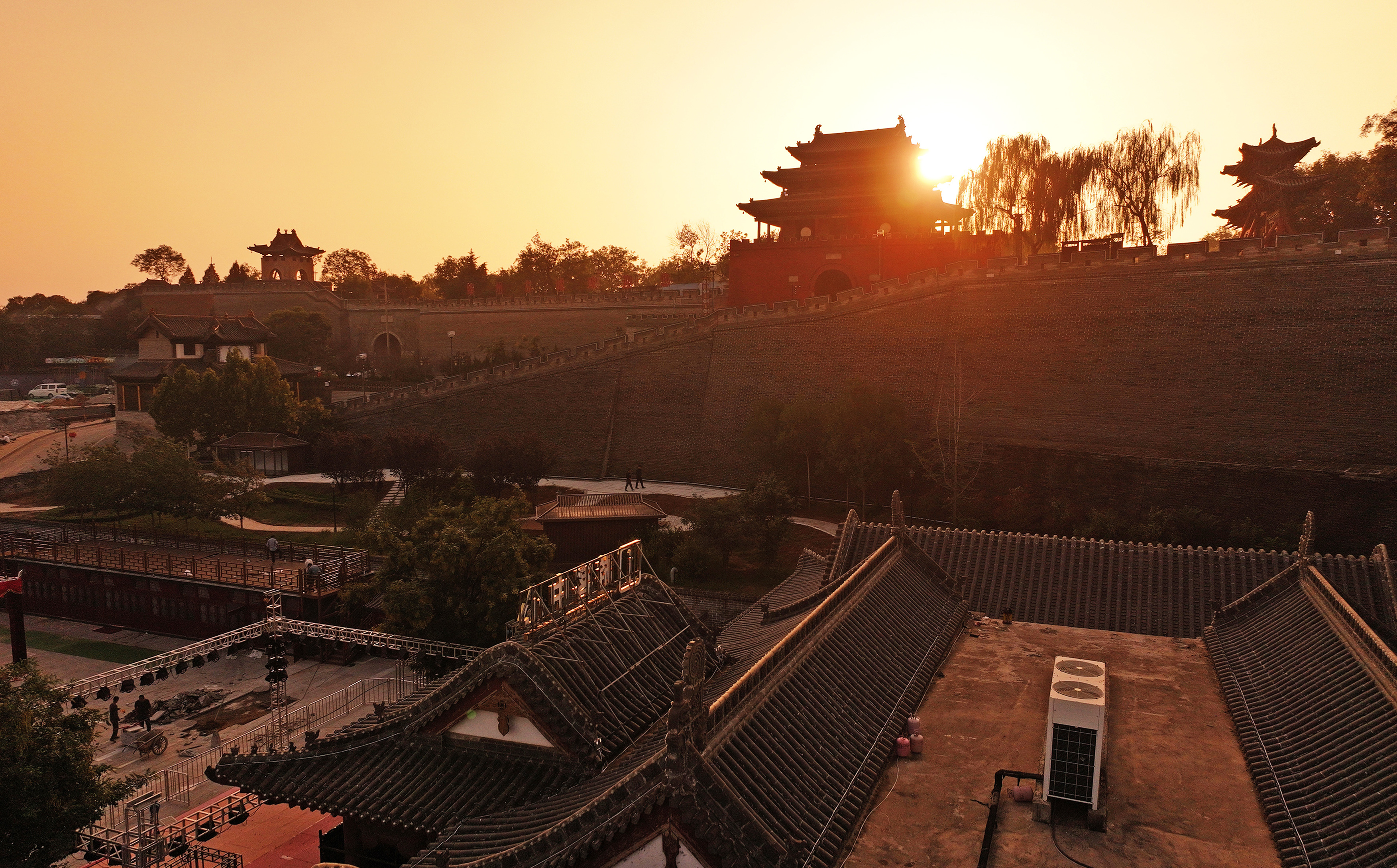 夕阳下,汾河岸畔的绛州古城敬候游客前来共度黄金周。