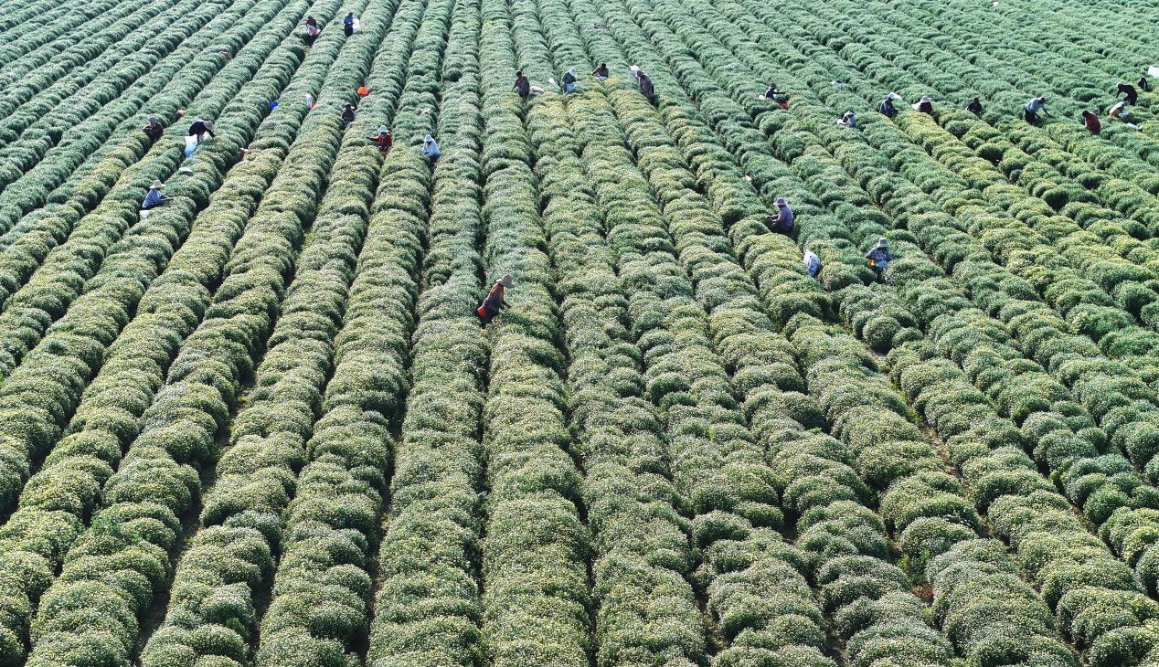 村民采摘菊花。