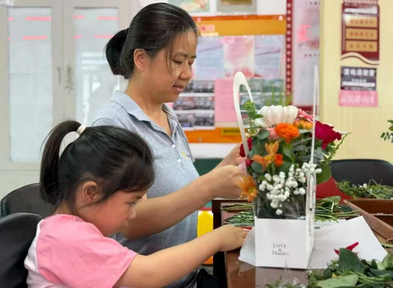 工作人员教小朋友插花。