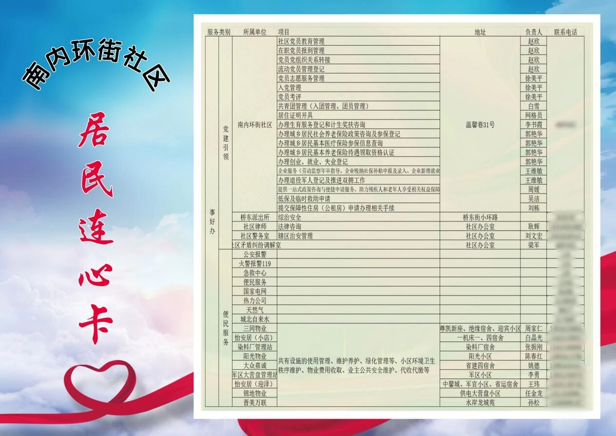 在阳光小区走访时,工作人员发现部分居民因为找不到可靠的水管维修电话而发愁,工作人员便记录在“需求清单”上。经过三个月的调研摸底,社区党委全面梳理了居民需求和辖区资源,通过召开党建协调委员会,与驻地单位、辖区商户、居民代表等共同商议“连心卡”内容及相关服务,最终设计出这张集多种功能于一身的“连心卡”。