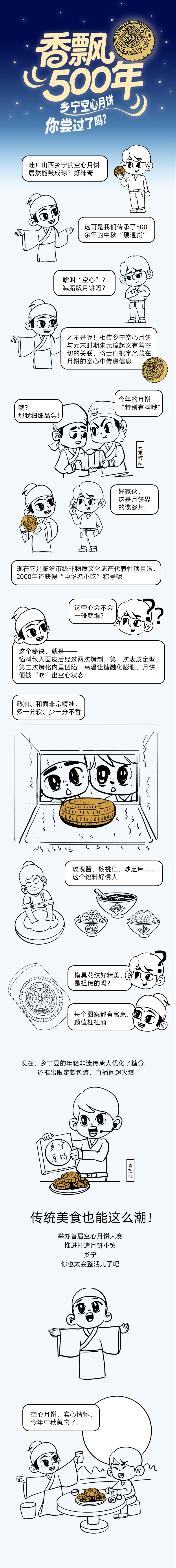 和面、抹油酥、切剂子、包馅、进模、脱模、送入烤炉……经过一道道工序,表皮金黄起酥、内里糖浆丝滑的空心月饼便新鲜出炉。连日来,临汾市乡宁县的大街小巷月饼飘香,这道承载着数百年历史的临汾市级非物质文化遗产,是乡宁人的专属印记。