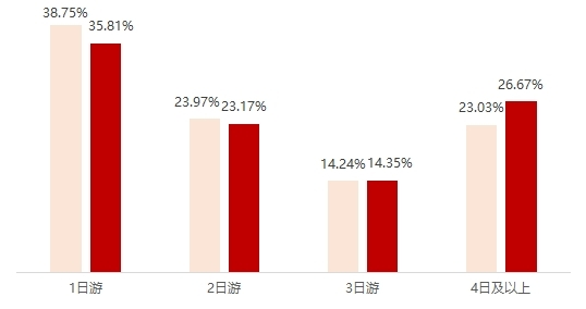 游客中,一日游占比最高,达35.81%,2日游占比为23.17%,3日游占比14.35%,4日及以上占比为26.67%。整体过夜率为64.19%,较2024年同期(61.37%)提升2.82个百分点。4日以上过夜游客占比同比上升3.64个百分点。“由此反映出在‘双节’叠加与夜间经济带动下,太原市游客结构逐步由短时旅行向长时游览转变。”师旭东表示。