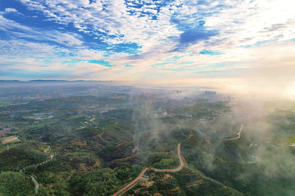 10月11日,雨后的平定县冠山空气清新,山林青翠欲滴,山巅白云舒展,山脚下的平定县城在云海中若隐若现。(杜爱清摄)