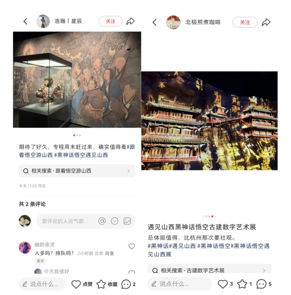 此次展览的成功举办,也吸引了媒体的广泛报道。多家媒体对展览的创新模式和消费潜力给予了积极评价。社交平台上,#黑神话悟空遇见山西展#、#古建数字艺术展#等话题的阅读量持续上升,网友们纷纷晒出观展照片,分享观展感受,称赞其“壮观”“太值了”“性价比高”“不虚此行”。