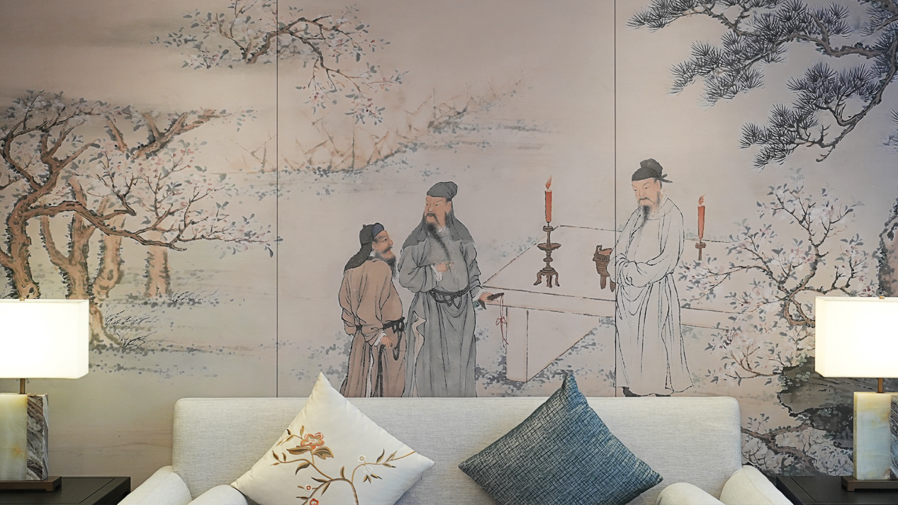 在酒店三层中餐厅的“忠义厅”,正位悬挂的“三约明志”屏风生动再现了关羽“降汉不降曹”的铮铮铁骨;左侧的“桃园三结义”背景墙,将刘关张的故事定格在眼前;右侧的关公画像威仪凛然,目光如炬。