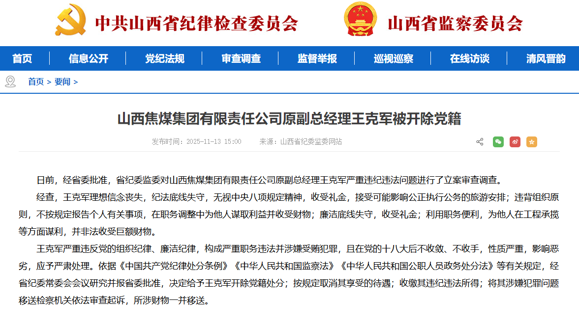 日前,经省委批准,省纪委监委对山西焦煤集团有限责任公司原副总经理王克军严重违纪违法问题进行了立案审查调查。