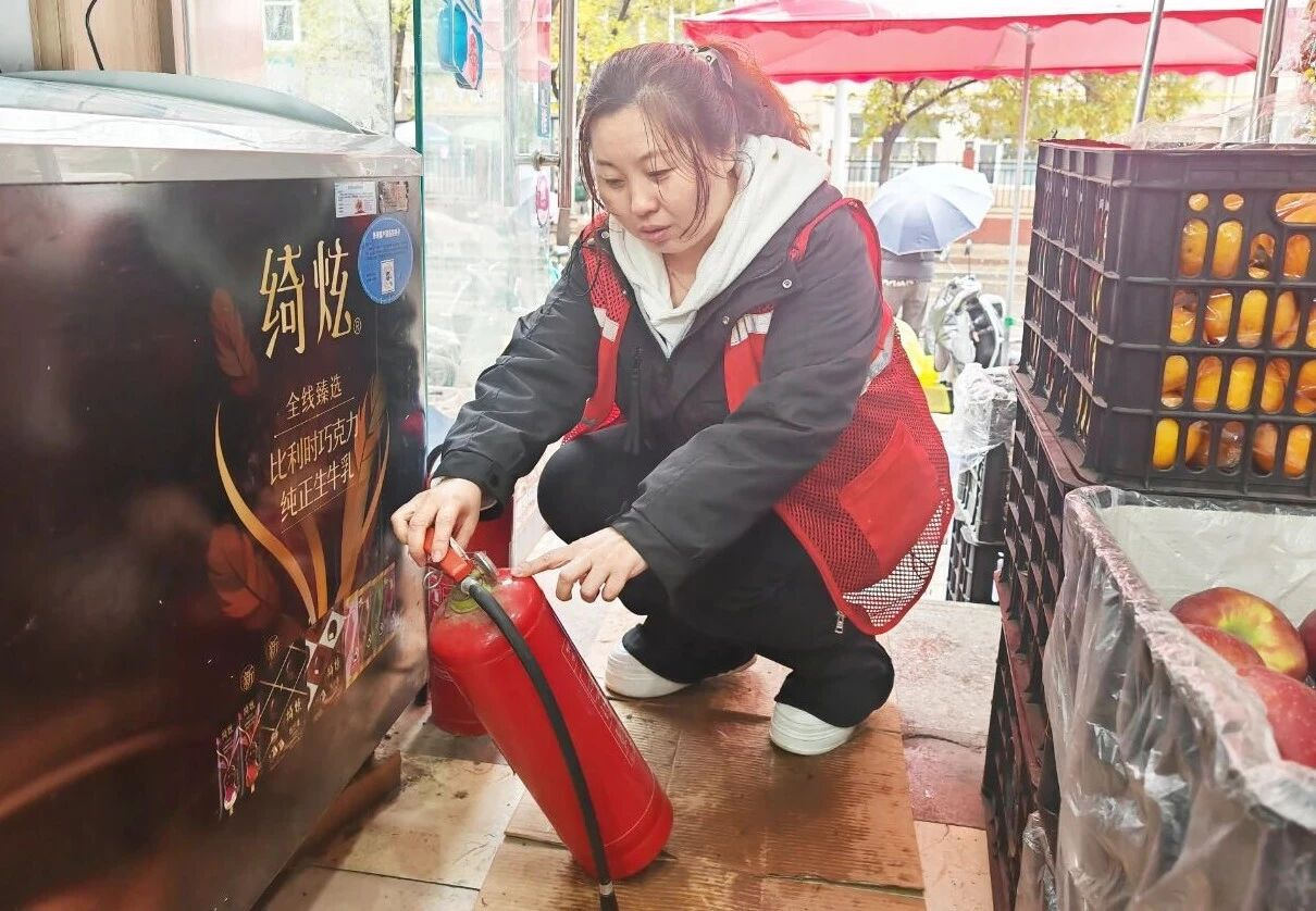 网格员小段在辖区巡查时发现,一家商铺的灭火器放置位置不合理,长期置于隐蔽角落,遇到火情难以快速取用。她立即告知商家,详细讲解了灭火器“显眼易取”对火灾应急的重要性。